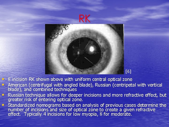 RK [6] • • 8 incision RK shown above with uniform central optical zone American (centrifugal with angled blade), Russian (centripetal with vertical blade), and combined techniques Russian technique allows for deeper incisions and more refractive effect, but greater risk of entering optical zone. Standardized nomograms based on analysis of previous cases determine the number of incisions and size of optical zone to create a given refractive effect. Typically 4 incisions for low myopia, 8 for moderate.