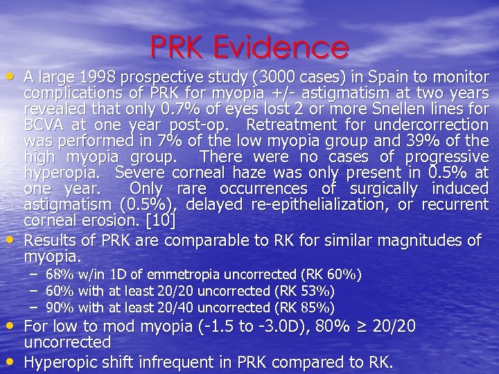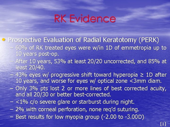 RK Evidence • Prospective Evaluation of Radial Keratotomy (PERK) – 60% of RK treated eyes were w/in 1 D of emmetropia up to 10 years post-op. – After 10 years, 53% at least 20/20 uncorrected, and 85% at least 20/40. – 43% eyes w/ progressive shift toward hyperopia ≥ 1 D after 10 years, and worse for eyes w/ optical zone <3 mm diam. – Only 3% pts lost 2 or more lines of best corrected acuity, and all 20/30 or better best-corrected. – <1% c/o severe glare or starburst during night. – 2% with corneal perforation, none req’d suturing. – Best results for low myopia group (-2. 00 to -3. 00 D) [1]