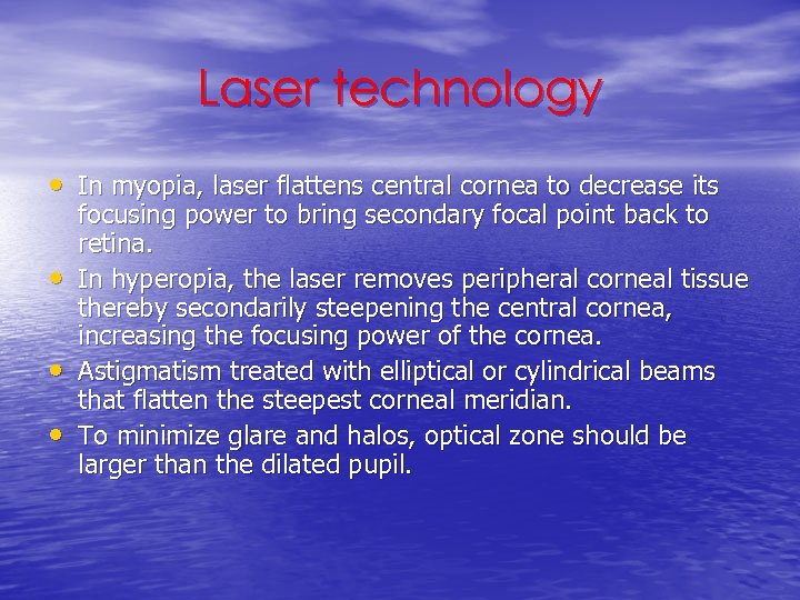 Laser technology • In myopia, laser flattens central cornea to decrease its • • • focusing power to bring secondary focal point back to retina. In hyperopia, the laser removes peripheral corneal tissue thereby secondarily steepening the central cornea, increasing the focusing power of the cornea. Astigmatism treated with elliptical or cylindrical beams that flatten the steepest corneal meridian. To minimize glare and halos, optical zone should be larger than the dilated pupil.