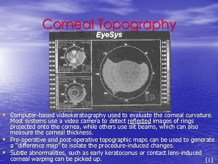 Corneal Topography • Computer-based videokeratography used to evaluate the corneal curvature. • • Most systems use a video camera to detect reflected images of rings projected onto the cornea, while others use slit beams, which can also measure the corneal thickness. Pre-operative and post-operative topographic maps can be used to generate a “difference map” to isolate the procedure-induced changes. Subtle abnormalities, such as early keratoconus or contact lens-induced corneal warping can be picked up. [1]