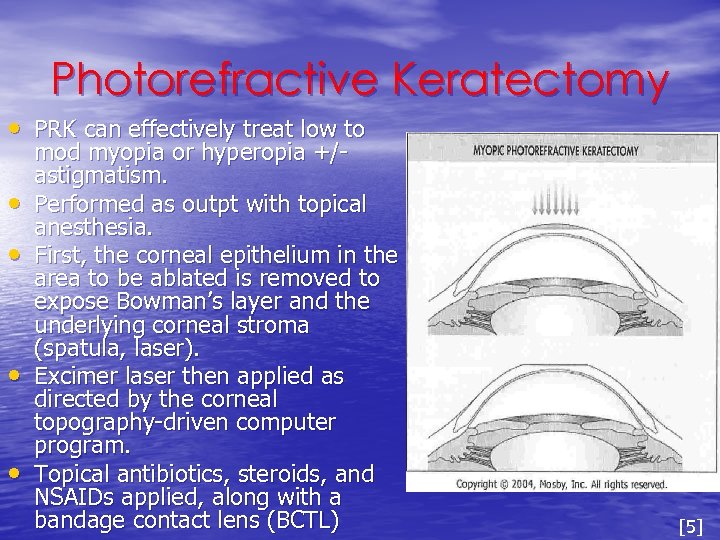 Photorefractive Keratectomy • PRK can effectively treat low to • • mod myopia or hyperopia +/astigmatism. Performed as outpt with topical anesthesia. First, the corneal epithelium in the area to be ablated is removed to expose Bowman’s layer and the underlying corneal stroma (spatula, laser). Excimer laser then applied as directed by the corneal topography-driven computer program. Topical antibiotics, steroids, and NSAIDs applied, along with a bandage contact lens (BCTL) [5]