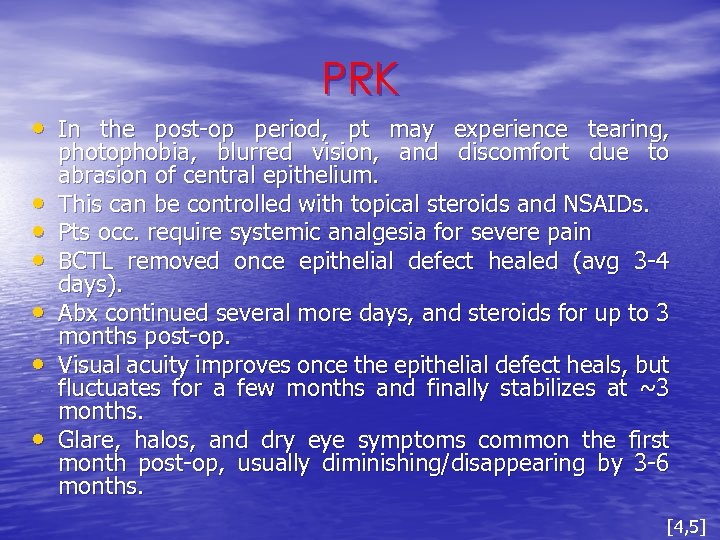 PRK • In the post-op period, pt may experience tearing, • • • photophobia, blurred vision, and discomfort due to abrasion of central epithelium. This can be controlled with topical steroids and NSAIDs. Pts occ. require systemic analgesia for severe pain BCTL removed once epithelial defect healed (avg 3 -4 days). Abx continued several more days, and steroids for up to 3 months post-op. Visual acuity improves once the epithelial defect heals, but fluctuates for a few months and finally stabilizes at ~3 months. Glare, halos, and dry eye symptoms common the first month post-op, usually diminishing/disappearing by 3 -6 months. [4, 5]