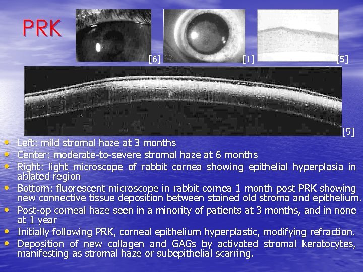PRK [6] [1] [5] • Left: mild stromal haze at 3 months • Center: moderate-to-severe stromal haze at 6 months • Right: light microscope of rabbit cornea showing epithelial hyperplasia in • • ablated region Bottom: fluorescent microscope in rabbit cornea 1 month post PRK showing new connective tissue deposition between stained old stroma and epithelium. Post-op corneal haze seen in a minority of patients at 3 months, and in none at 1 year Initially following PRK, corneal epithelium hyperplastic, modifying refraction. Deposition of new collagen and GAGs by activated stromal keratocytes, manifesting as stromal haze or subepithelial scarring.