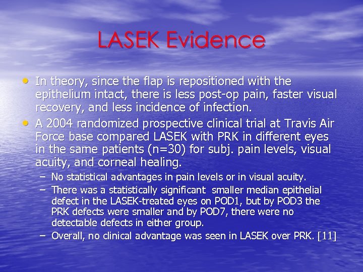 LASEK Evidence • In theory, since the flap is repositioned with the • epithelium intact, there is less post-op pain, faster visual recovery, and less incidence of infection. A 2004 randomized prospective clinical trial at Travis Air Force base compared LASEK with PRK in different eyes in the same patients (n=30) for subj. pain levels, visual acuity, and corneal healing. – No statistical advantages in pain levels or in visual acuity. – There was a statistically significant smaller median epithelial defect in the LASEK-treated eyes on POD 1, but by POD 3 the PRK defects were smaller and by POD 7, there were no detectable defects in either group. – Overall, no clinical advantage was seen in LASEK over PRK. [11]