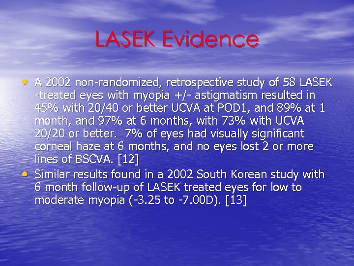 LASEK Evidence • A 2002 non-randomized, retrospective study of 58 LASEK • -treated eyes with myopia +/- astigmatism resulted in 45% with 20/40 or better UCVA at POD 1, and 89% at 1 month, and 97% at 6 months, with 73% with UCVA 20/20 or better. 7% of eyes had visually significant corneal haze at 6 months, and no eyes lost 2 or more lines of BSCVA. [12] Similar results found in a 2002 South Korean study with 6 month follow-up of LASEK treated eyes for low to moderate myopia (-3. 25 to -7. 00 D). [13]