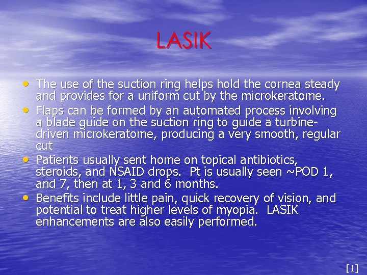 LASIK • The use of the suction ring helps hold the cornea steady • • • and provides for a uniform cut by the microkeratome. Flaps can be formed by an automated process involving a blade guide on the suction ring to guide a turbinedriven microkeratome, producing a very smooth, regular cut Patients usually sent home on topical antibiotics, steroids, and NSAID drops. Pt is usually seen ~POD 1, and 7, then at 1, 3 and 6 months. Benefits include little pain, quick recovery of vision, and potential to treat higher levels of myopia. LASIK enhancements are also easily performed. [1]
