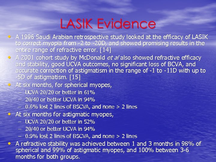 LASIK Evidence • A 1996 Saudi Arabian retrospective study looked at the efficacy of LASIK • • to correct myopia from -2 to -20 D, and showed promising results in the entire range of refractive error. [14] A 2001 cohort study by Mc. Donald et al also showed refractive efficacy and stability, good UCVA outcomes, no significant loss of BCVA, and accurate correction of astigmatism in the range of -1 to -11 D with up to -5 D of astigmatism. [15] At six months, for spherical myopes, – UCVA 20/20 or better in 61% – 20/40 or better UCVA in 94% – 0. 6% lost 2 lines of BSCVA, and none > 2 lines • At six months for astigmatic myopes, – – – UCVA 20/20 or better in 52% 20/40 or better UCVA in 94% 0. 9% lost 2 lines of BSCVA, and none > 2 lines • A refractive stability was achieved between 1 and 3 months in 98% of spherical and 99% of astigmatic myopes, and 100% between 3 -6 months for both groups.
