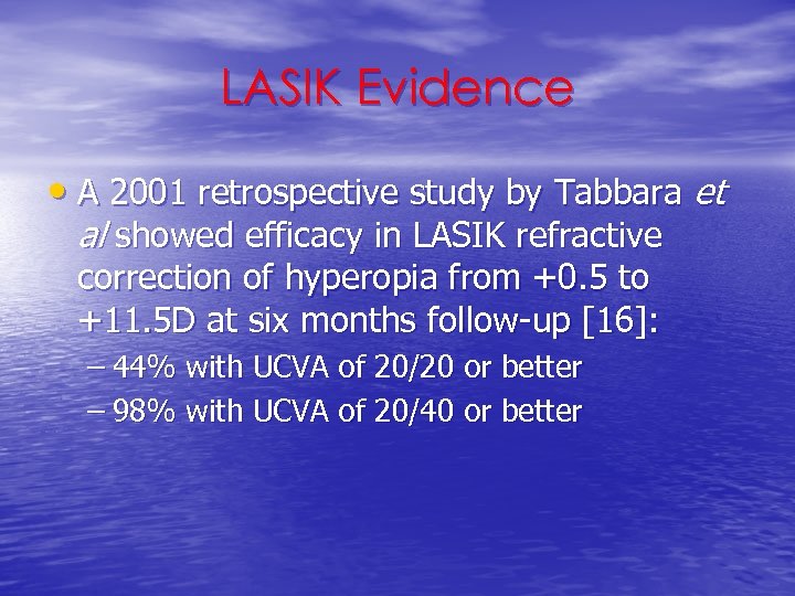 LASIK Evidence • A 2001 retrospective study by Tabbara et al showed efficacy in LASIK refractive correction of hyperopia from +0. 5 to +11. 5 D at six months follow-up [16]: – 44% with UCVA of 20/20 or better – 98% with UCVA of 20/40 or better