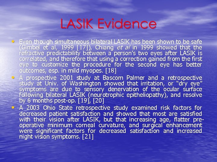 LASIK Evidence • Even though simultaneous bilateral LASIK has been shown to be safe • • (Gimbel et al, 1999 [17]), Chiang et al in 1999 showed that the refractive predictability between a person’s two eyes after LASIK is correlated, and therefore that using a correction gained from the first eye to customize the procedure for the second eye has better outcomes, esp. in mild myopes. [18] A prospective 2001 study at Bascom Palmer and a retrospective study at Univ. of Washington showed that irritation, or “dry eye” symptoms are due to sensory denervation of the ocular surface following bilateral LASIK (neurotrophic epitheliopathy), and resolve by 6 months post-op. [19], [20] A 2003 Ohio State retrospective study examined risk factors for decreased patient satisfaction and showed that most are satisfied with their vision after LASIK, but that increasing age, flatter preoperative minimum corneal curvature, and surgical enhancement were significant factors for decreased satisfaction and increased night vision symptoms. [21]