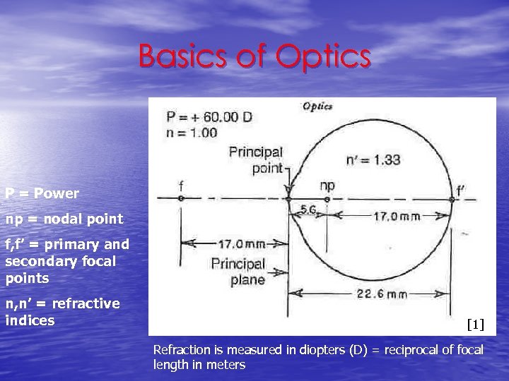 Basics of Optics P = Power np = nodal point f, f’ = primary and secondary focal points n, n’ = refractive indices [1] Refraction is measured in diopters (D) = reciprocal of focal length in meters