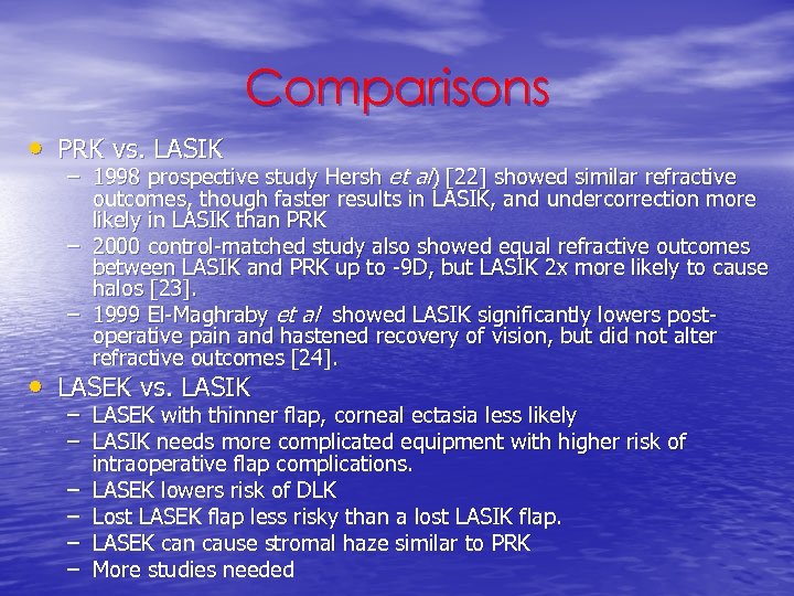 Comparisons • PRK vs. LASIK – 1998 prospective study Hersh et al) [22] showed similar refractive outcomes, though faster results in LASIK, and undercorrection more likely in LASIK than PRK – 2000 control-matched study also showed equal refractive outcomes between LASIK and PRK up to -9 D, but LASIK 2 x more likely to cause halos [23]. – 1999 El-Maghraby et al showed LASIK significantly lowers postoperative pain and hastened recovery of vision, but did not alter refractive outcomes [24]. • LASEK vs. LASIK – – – LASEK with thinner flap, corneal ectasia less likely LASIK needs more complicated equipment with higher risk of intraoperative flap complications. LASEK lowers risk of DLK Lost LASEK flap less risky than a lost LASIK flap. LASEK can cause stromal haze similar to PRK More studies needed