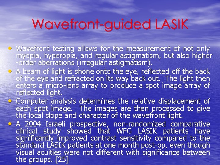 Wavefront-guided LASIK • Wavefront testing allows for the measurement of not only • • • myopia, hyperopia, and regular astigmatism, but also higher -order aberrations (irregular astigmatism). A beam of light is shone onto the eye, reflected off the back of the eye and refracted on its way back out. The light then enters a micro-lens array to produce a spot image array of reflected light. Computer analysis determines the relative displacement of each spot image. The images are then processed to give the local slope and character of the wavefront light. A 2004 Israeli prospective, non-randomized comparative clinical study showed that WFG LASIK patients have significantly improved contrast sensitivity compared to the standard LASIK patients at one month post-op, even though visual acuities were not different with significance between the groups. [25]