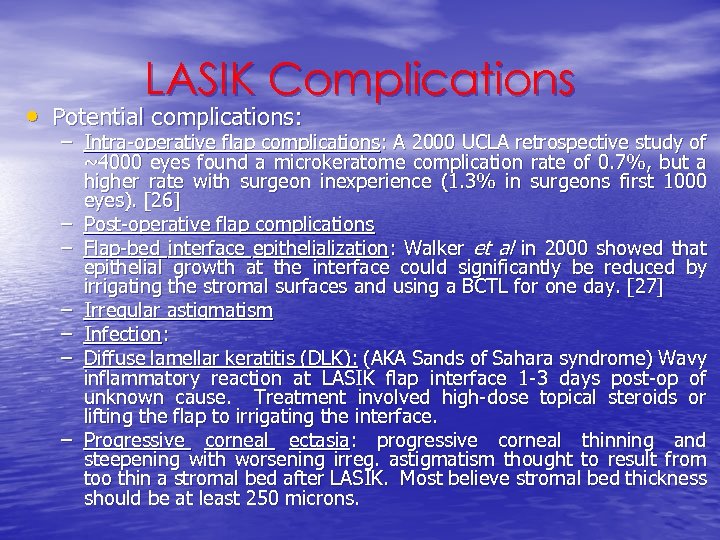 LASIK Complications • Potential complications: – Intra-operative flap complications: A 2000 UCLA retrospective study of ~4000 eyes found a microkeratome complication rate of 0. 7%, but a higher rate with surgeon inexperience (1. 3% in surgeons first 1000 eyes). [26] – Post-operative flap complications – Flap-bed interface epithelialization: Walker et al in 2000 showed that epithelial growth at the interface could significantly be reduced by irrigating the stromal surfaces and using a BCTL for one day. [27] – Irregular astigmatism – Infection: – Diffuse lamellar keratitis (DLK): (AKA Sands of Sahara syndrome) Wavy inflammatory reaction at LASIK flap interface 1 -3 days post-op of unknown cause. Treatment involved high-dose topical steroids or lifting the flap to irrigating the interface. – Progressive corneal ectasia: progressive corneal thinning and steepening with worsening irreg. astigmatism thought to result from too thin a stromal bed after LASIK. Most believe stromal bed thickness should be at least 250 microns.