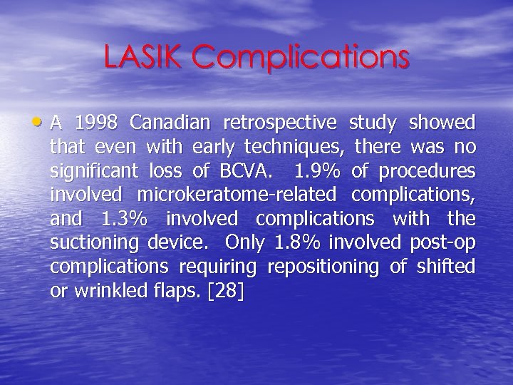 LASIK Complications • A 1998 Canadian retrospective study showed that even with early techniques, there was no significant loss of BCVA. 1. 9% of procedures involved microkeratome-related complications, and 1. 3% involved complications with the suctioning device. Only 1. 8% involved post-op complications requiring repositioning of shifted or wrinkled flaps. [28]