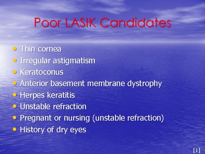 Poor LASIK Candidates • Thin cornea • Irregular astigmatism • Keratoconus • Anterior basement membrane dystrophy • Herpes keratitis • Unstable refraction • Pregnant or nursing (unstable refraction) • History of dry eyes [1]