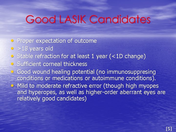Good LASIK Candidates • • • Proper expectation of outcome >18 years old Stable refraction for at least 1 year (<1 D change) Sufficient corneal thickness Good wound healing potential (no immunosuppresing conditions or medications or autoimmune conditions). Mild to moderate refractive error (though high myopes and hyperopes, as well as higher-order aberrant eyes are relatively good candidates) [5]