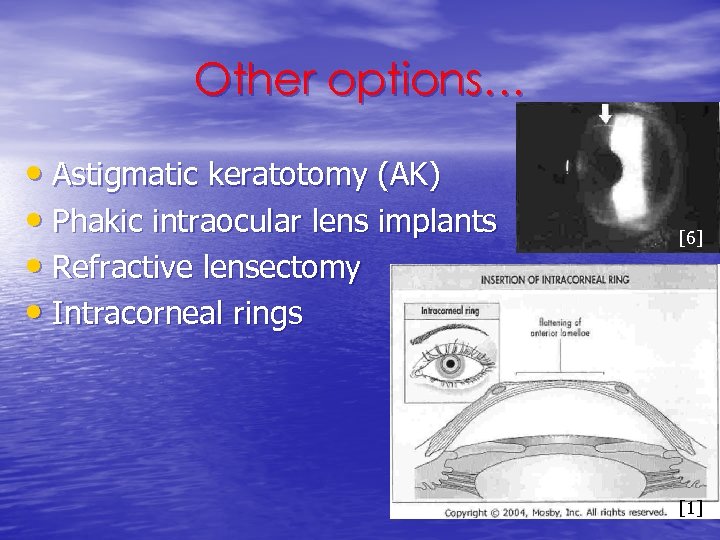 Other options… • Astigmatic keratotomy (AK) • Phakic intraocular lens implants • Refractive lensectomy • Intracorneal rings [6] [1]