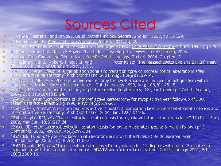 • • • • Sources Cited 1) Vander, James F. and Janice A Gault, Ophthalmology Secrets, 2 nd ed. 2002, pp 11 -129. 2) Netter, Frank H. Atlas of Human Anatomy, 2 nd ed. 2001, pg 82. 3)Rohen, Johannes W. , Chihiro Yokocki and Elke Lutjen-Drecoll Color Atlas of Anatomy 4 th ed. 1998, pg 129. 4) Weichel, Eric D and Kraig S Bower, “Laser Refractive Surgery, ” www. Up. To. Date. com, 2005. 5) Abad, Juan Carlos, and Dimitri Azar, Yanoff: Ophthalmology, 2 nd ed. 2004. Chapter 15. 6)Friedman, Neil J. , Roberto Pineda II, and Peter Kaiser, The Massachusetts Eye and Ear Infirmary Illustrated Manuel of Ophthalmology, 1998. 7)Endl, MJ, et al “Effect of larger ablation zone and transition zone on corneal optical aberrations after photorefractive keratectomy” Arch Ophthalmol 2001, Aug; 119(8): 1159 -64. 8)Mc. Donald, MB, et al “Photorefractive keratectomy for low-to-moderate myopia and astigmatism with a small-beam, tracker-directed excimer laser. ” Ophthalmology 1999, Aug; 106(8): 1481 -8. 9)Rajan, MS, et al “A long-term study of photorefractive keratectomy; 12 -year follow-up. ” Ophthalmology 2004, Oct; 111(10): 1813 -24. 10)Alio, JL, et al “Complications of photorefractive keratectomy for myopia: two year follow-up of 3000 cases” Cataract Refract Surg 1998, May; 24(5): 619 -26. 11)Pirouzian, A, et al “A randomized prospective clinical trial comparing laser subepithelial Keratomileusis and photorefractive keratectomy” Arch Ophthalmol 2004, Jan; 122(1): 11 -6. 12)Rouweyha, RM, et al “Laser epithelial keratomileusis for myopia with the autonomous laser” J Refract Surg 2002, May-Jun; 18(3): 217 -24. 13)Lee, JB, et al “Laser subepithelial keratomileusis for low to moderate myopia: 6 -month follow-up” J Ophthalmol 2002, May-Jun; 46(3)299 -304. 14)Zadok, D, et al “Hyperopic laser in situ keratomileusis with the Nidek EC-5000 excimer laser” Ophthalmology 2000, Jun; 107(6): 1132 -7. 15)Mc. Donald, MB, et al “Laser in situ keratmileusis for myopia up to -11 diopters with up to -5 diopters of astigmatism with the summit autonomous LADARVision excimer laser system” Ophthalmology 2001, Feb; 108(2): 309 -16.