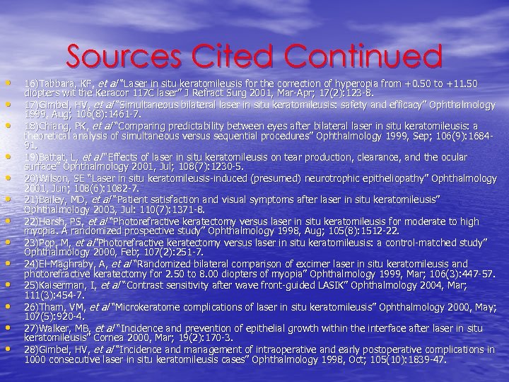 • • • • Sources Cited Continued 16)Tabbara, KF, et al “Laser in situ keratomileusis for the correction of hyperopia from +0. 50 to +11. 50 diopters wit the Keracor 117 C laser” J Refract Surg 2001, Mar-Apr; 17(2): 123 -8. 17)Gimbel, HV, et al “Simultaneous bilateral laser in situ keratomileusis: safety and efficacy” Ophthalmology 1999, Aug; 106(8): 1461 -7. 18)Chiang, PK, et al “Comparing predictability between eyes after bilateral laser in situ keratomileusis: a theoretical analysis of simultaneous versus sequential procedures” Ophthalmology 1999, Sep; 106(9): 168491. 19)Battat, L, et al “Effects of laser in situ keratomileusis on tear production, clearance, and the ocular surface” Ophthalmology 2001, Jul; 108(7): 1230 -5. 20)Wilson, SE “Laser in situ keratomileusis-induced (presumed) neurotrophic epitheliopathy” Ophthalmology 2001, Jun; 108(6): 1082 -7. 21)Bailey, MD, et al “Patient satisfaction and visual symptoms after laser in situ keratomileusis” Ophthalmology 2003, Jul: 110(7): 1371 -8. 22)Hersh, PS, et al “Photorefractive keratectomy versus laser in situ keratomileusis for moderate to high myopia. A randomized prospective study” Ophthalmology 1998, Aug; 105(8): 1512 -22. 23)Pop, M, et al”Photorefractive keratectomy versus laser in situ keratomileusis: a control-matched study” Ophthalmology 2000, Feb; 107(2): 251 -7. 24)El-Maghraby, A, et al “Randomized bilateral comparison of excimer laser in situ keratomileusis and photorefractive keratectomy for 2. 50 to 8. 00 diopters of myopia” Ophthalmology 1999, Mar; 106(3): 447 -57. 25)Kaiserman, I, et al “Contrast sensitivity after wave front-guided LASIK” Ophthalmology 2004, Mar; 111(3): 454 -7. 26)Tham, VM, et al “Microkeratome complications of laser in situ keratomileusis” Ophthalmology 2000, May; 107(5): 920 -4. 27)Walker, MB, et al “Incidence and prevention of epithelial growth within the interface after laser in situ keratomileusis” Cornea 2000, Mar; 19(2): 170 -3. 28)Gimbel, HV, et al “Incidence and management of intraoperative and early postoperative complications in 1000 consecutive laser in situ keratomileusis cases” Ophthalmology 1998, Oct; 105(10): 1839 -47.