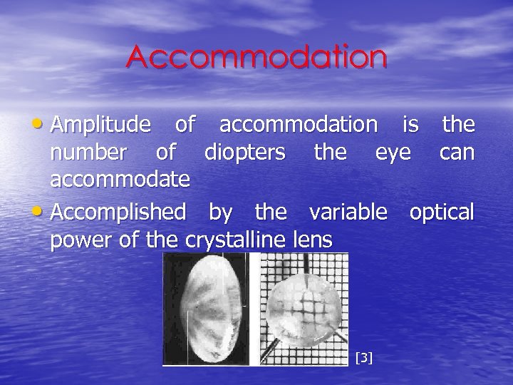 Accommodation • Amplitude of accommodation is the number of diopters the eye can accommodate • Accomplished by the variable optical power of the crystalline lens [3]