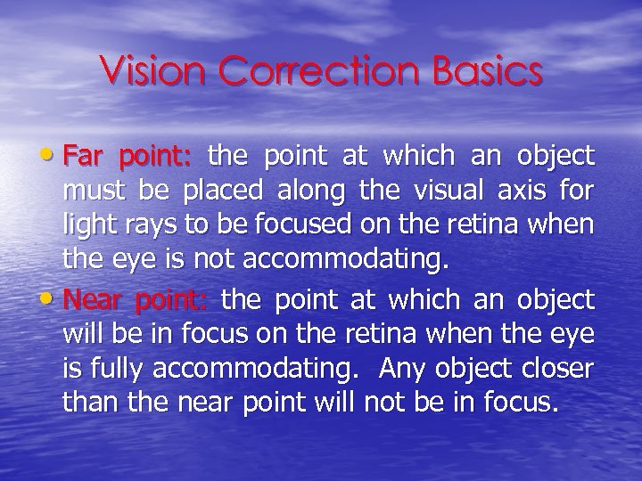 Vision Correction Basics • Far point: the point at which an object must be placed along the visual axis for light rays to be focused on the retina when the eye is not accommodating. • Near point: the point at which an object will be in focus on the retina when the eye is fully accommodating. Any object closer than the near point will not be in focus.