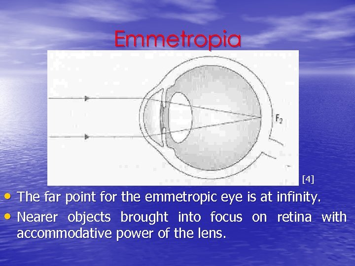 Emmetropia [4] • The far point for the emmetropic eye is at infinity. • Nearer objects brought into focus on retina with accommodative power of the lens.