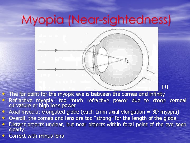 Myopia (Near-sightedness) [4] • The far point for the myopic eye is between the cornea and infinity • Refractive myopia: too much refractive power due to steep corneal • • curvature or high lens power Axial myopia: elongated globe (each 1 mm axial elongation = 3 D myopia) Overall, the cornea and lens are too “strong” for the length of the globe. Distant objects unclear, but near objects within focal point of the eye seen clearly. Correct with minus lens