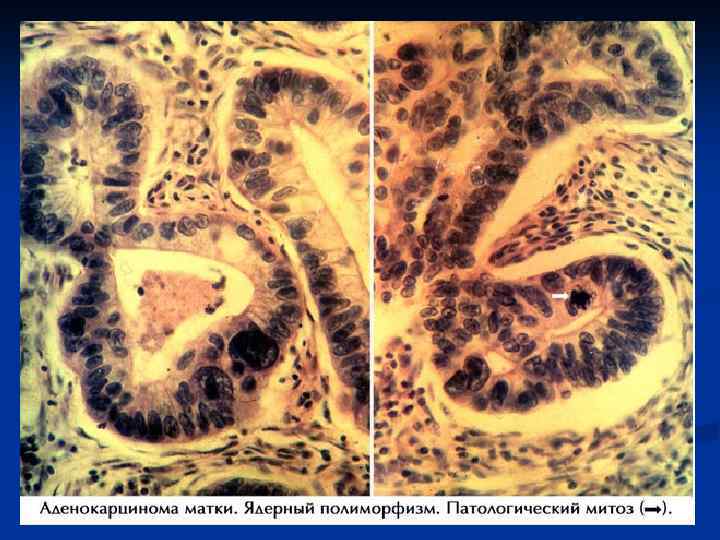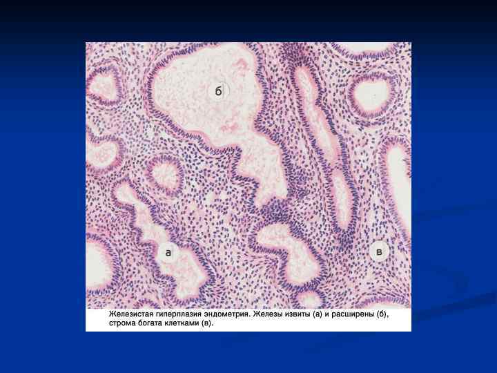 Плоскоклеточная метаплазия (лейкоплакия) шейки матки. Участок шейки матки выстлан многослойным плоским эпителием (1).