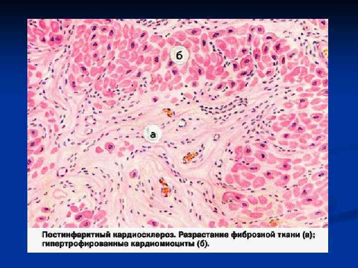 Гипертрофия миокарда. Мышечные клетки миокарда резко увеличены, содержат крупные, гиперхромные ядра (1). Склероз стромы миокарда.