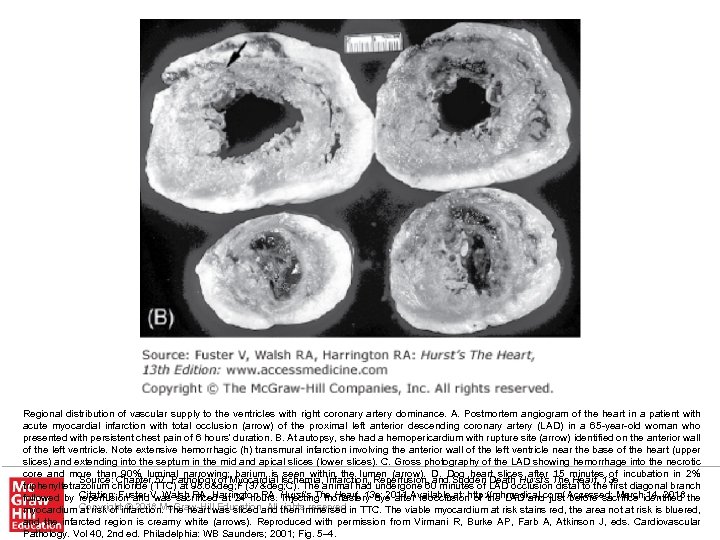 Regional distribution of vascular supply to the ventricles with right coronary artery dominance. A. Postmortem angiogram of the heart in a patient with acute myocardial infarction with total occlusion (arrow) of the proximal left anterior descending coronary artery (LAD) in a 65 -year-old woman who presented with persistent chest pain of 6 hours' duration. B. At autopsy, she had a hemopericardium with rupture site (arrow) identified on the anterior wall of the left ventricle. Note extensive hemorrhagic (h) transmural infarction involving the anterior wall of the left ventricle near the base of the heart (upper slices) and extending into the septum in the mid and apical slices (lower slices). C. Gross photography of the LAD showing hemorrhage into the necrotic core and more than 90% luminal narrowing; barium is seen within the lumen (arrow). D. Dog heart slices after 15 minutes of incubation in 2% Source: Chapter 57. Pathology of Myocardial Ischemia, Infarction, Reperfusion, and Sudden Death Hurst's The Heart, 13 e , triphenyltetrazolium chloride (TTC) at 98. 6° F (37° C). The animal had undergone 60 minutes of LAD occlusion distal to the first diagonal branch Citation: Fuster was sacrificed at 24 hours. Injecting monastery dye after reocclusion of the LAD and just before sacrifice 14, 2018 followed by reperfusion and. V, Walsh RA, Harrington RA. Hurst's The Heart, 13 e; 2011 Available at: http: //mhmedical. com/ Accessed: Marchidentified the myocardium Copyrightinfarction. The heart was sliced and then immersed in TTC. The viable myocardium at risk stains red, the area not at risk is bluered, at risk of © 2018 Mc. Graw-Hill Education. All rights reserved and the infarcted region is creamy white (arrows). Reproduced with permission from Virmani R, Burke AP, Farb A, Atkinson J, eds. Cardiovascular Pathology. Vol 40, 2 nd ed. Philadelphia: WB Saunders; 2001; Fig. 5– 4.