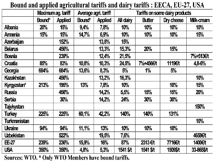 IV – Why and how to refound the EECA’s agricultural policies on food sovereignty Not a single country, no Southern country either, has industrialised without an efficient protection of its agriculture and the EU is still protecting at a very high level its basic foods: cereals, dairy, meat, sugar. And it is absurd that EEAC’s countries go on with increased food deficits, particularly in the context of climate change and of the need to feed 9 billion people in 2050 where at least EECA should remain self-sufficient in food. Russia has begun to realize this necessity in its Food security objective decided the 30 January 2010 to cover at least 95% of its national consumption in grains, 90% in dairy and 85% in meat. To achieve these onjective it should resist to the pressures to lower its agricultural tariffs in its negotiation to join the WTO. Unfortunately this has not been the case for Ukraine which has agreed to bind them at a too low level when it has joined the WTO in 2008.