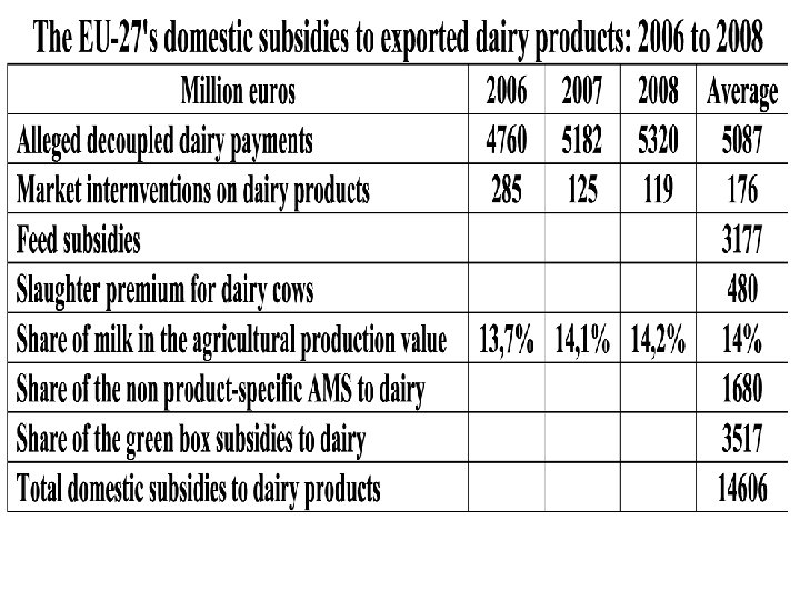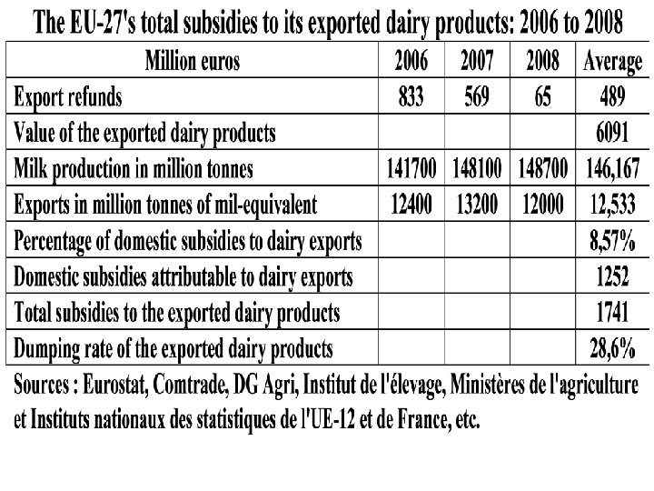 2) The huge dumping of the EU-27 dairy exports The $1. 283 bn of average EU-27 dairy exports to EECA from 2006 to 2008 have been largely possible owing to a huge dumping of $367 mn or of 28. 6%. Indeed the EU has subsidized by € 1. 741 bn on average its € 6. 091 bn of dairy exports, that is at 28. 6%. The export refunds have only represented 28% of total and domestic subsidies 72%. If the export refunds have dropped from € 833 mn in 2006 to € 65 mn in 2008 – they had reached € 2 bn in 1997 – they have resumed in 2009 and reached again € 279 mn from end January 2009 to end January 2010.