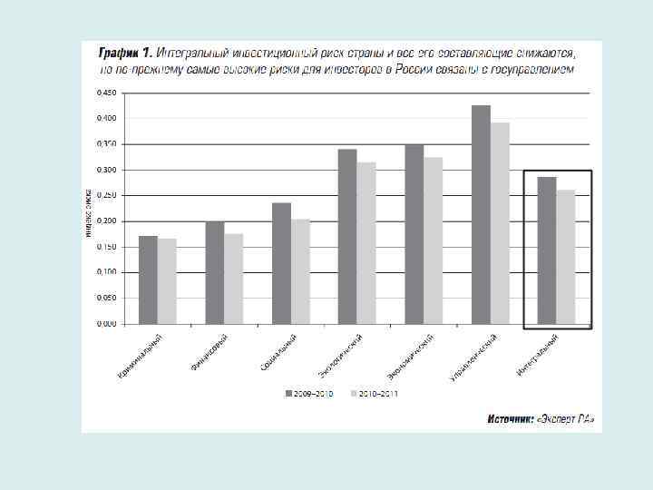 Динамика рейтинга отдельных регионов по показателю интегрального инвестиционного риска Регионы 20002001 20062007 20082009 20102011 Новгородская область 1 6 19 32 37 Москва 2 9 6 11 10 Белгородская область 3 5 14 2 2 Калининградская область 4 3 33 42 28 Санкт Петербург 5 1 4 5 4 Вологодская область 6 10 20 41 32 Краснодарский край 7 4 2 1 5 Ярославская область 8 10 21 29 22 Республика Татарстан 9 7 12 9 7 Орловская область 10 25 45 62 59 Источник: По данным рейтингового агентства «Эксперт РА» 2013
