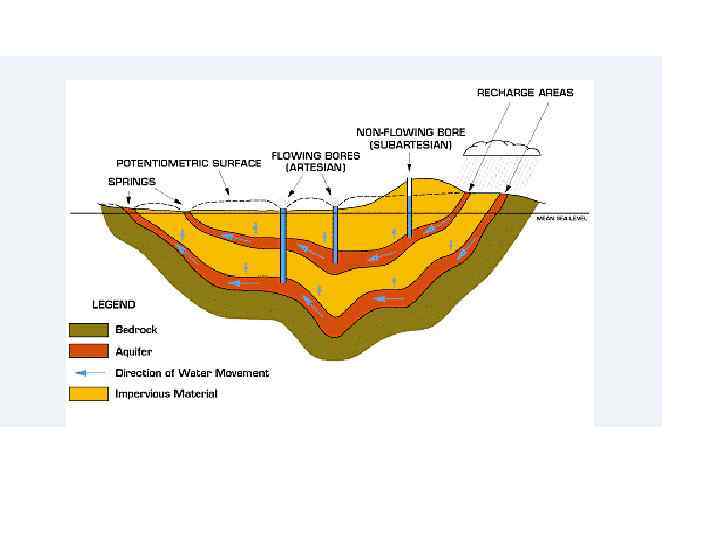 Питание подземных вод артезианские бассейны получают из внешних и внутренних областей. Внешние области находятся за границей артезианского бассейна и расположены в пределах структур, составляющих его обрамление Различают краевые и внутренние области перелива. Краевые области перелива располагаются на границе артезианских бассейнов и характеризуются переливом из гидрогеологического массива в артезианский бассейн, т. е. артезианский бассейн питается за счет вод ГМ. К внутренней области перелива подземных вод относят область перелива из одного артезианского бассейна в другой, реализуемого в пределах одной артезианской области или смежных артезианских бассейнов. Очаги перелива из одного водоносного горизонта в другой наблюдаются во многих артезианских бассейнах. Широко распространен перелив грунтовых вод в артезианские в областях питания и из артезианских водоносных горизонтов в грунтовые – в очагах разгрузки артезианских вод.