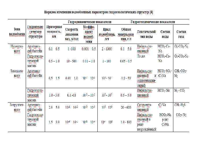 Обычно гидрогеохимическая гидродинамической. зональность связана с Как правило, с верхней зоной интенсивного (активного) водообмена связаны пресные слабоминерализованные HCO 3 Ca Mg воды. Зона замедленного водообмена характеризуется водами сложного состава Cl SO 4 HCO 3 Na Ca Mg и др. , а зона затрудненного водообмена водами высокой минерализации чаще всего Cl Na Ca состава.