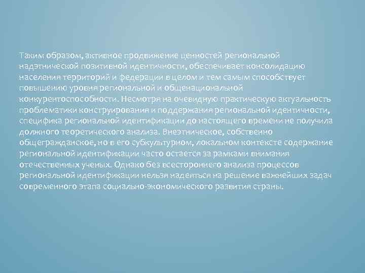 Таким образом, активное продвижение ценностей региональной надэтнической позитивной идентичности, обеспечивает консолидацию населения территорий и федерации в целом и тем самым способствует повышению уровня региональной и общенациональной конкурентоспособности. Несмотря на очевидную практическую актуальность проблематики конструирования и поддержания региональной идентичности, специфика региональной идентификации до настоящего времени не получила должного теоретического анализа. Внеэтническое, собственно общегражданское, но в его субкультурном, локальном контексте содержание региональной идентификации часто остается за рамками внимания отечественных ученых. Однако без всестороннего анализа процессов региональной идентификации нельзя надеяться на решение важнейших задач современного этапа социально-экономического развития страны.