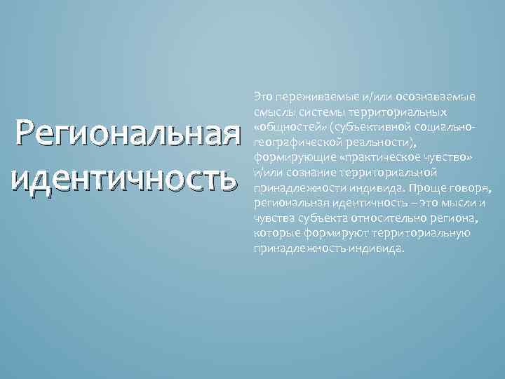 Региональная идентичность Это переживаемые и/или осознаваемые смыслы системы территориальных «общностей» (субъективной социальногеографической реальности), формирующие «практическое чувство» и/или сознание территориальной принадлежности индивида. Проще говоря, региональная идентичность – это мысли и чувства субъекта относительно региона, которые формируют территориальную принадлежность индивида.