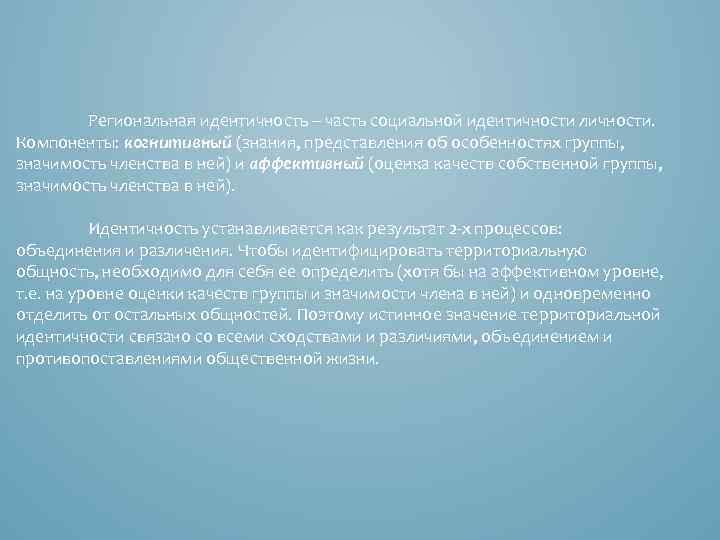 Региональная идентичность – часть социальной идентичности личности. Компоненты: когнитивный (знания, представления об особенностях группы, значимость членства в ней) и аффективный (оценка качеств собственной группы, значимость членства в ней). Идентичность устанавливается как результат 2 -х процессов: объединения и различения. Чтобы идентифицировать территориальную общность, необходимо для себя ее определить (хотя бы на аффективном уровне, т. е. на уровне оценки качеств группы и значимости члена в ней) и одновременно отделить от остальных общностей. Поэтому истинное значение территориальной идентичности связано со всеми сходствами и различиями, объединением и противопоставлениями общественной жизни.