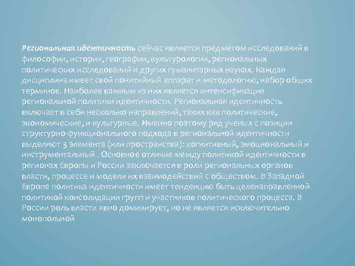 Региональная идентичность сейчас является предметом исследований в философии, истории, географии, культурологии, региональных политических исследований и других гуманитарных науках. Каждая дисциплина имеет свой понятийный аппарат и методологию, набор общих терминов. Наиболее важным из них является интенсификация региональной политики идентичности. Региональная идентичность включает в себя несколько направлений, таких как политические, экономические, и культурные. Именно поэтому ряд ученых с позиции структурно-функционального подхода в региональной идентичности выделяют 3 элемента (или пространства): когнитивный, эмоциональный и инструментальный. Основное отличие между политикой идентичности в регионах Европы и России заключается в роли региональных органов власти, процессе и модели их взаимодействий с обществом. В Западной Европе политика идентичности имеет тенденцию быть целенаправленной политикой консолидации групп и участников политического процесса. В России роль власти явно доминирует, но не является исключительно монопольной