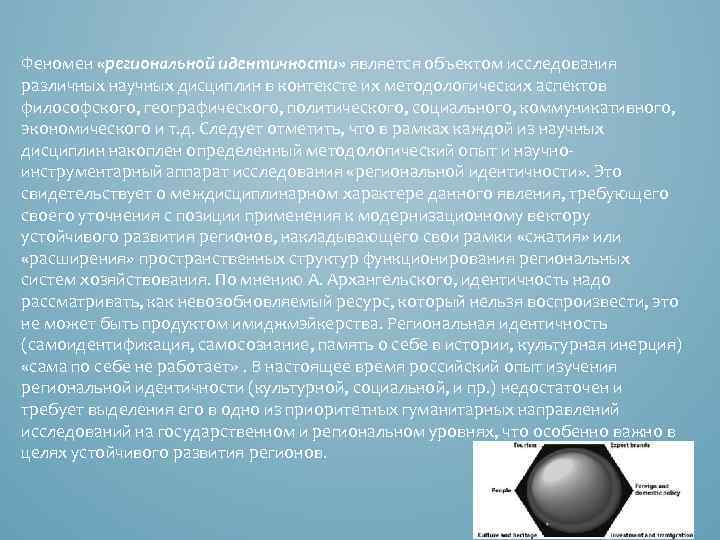 Феномен «региональной идентичности» является объектом исследования различных научных дисциплин в контексте их методологических аспектов философского, географического, политического, социального, коммуникативного, экономического и т. д. Следует отметить, что в рамках каждой из научных дисциплин накоплен определенный методологический опыт и научноинструментарный аппарат исследования «региональной идентичности» . Это свидетельствует о междисциплинарном характере данного явления, требующего своего уточнения с позиции применения к модернизационному вектору устойчивого развития регионов, накладывающего свои рамки «сжатия» или «расширения» пространственных структур функционирования региональных систем хозяйствования. По мнению А. Архангельского, идентичность надо рассматривать, как невозобновляемый ресурс, который нельзя воспроизвести, это не может быть продуктом имиджмэйкерства. Региональная идентичность (самоидентификация, самосознание, память о себе в истории, культурная инерция) «сама по себе не работает» . В настоящее время российский опыт изучения региональной идентичности (культурной, социальной, и пр. ) недостаточен и требует выделения его в одно из приоритетных гуманитарных направлений исследований на государственном и региональном уровнях, что особенно важно в целях устойчивого развития регионов.