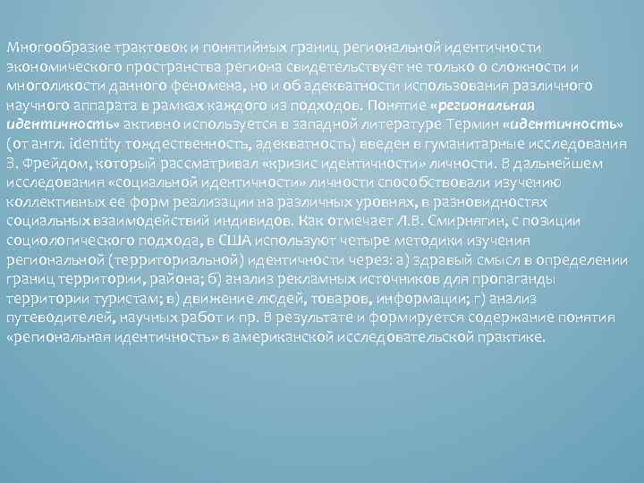 Многообразие трактовок и понятийных границ региональной идентичности экономического пространства региона свидетельствует не только о сложности и многоликости данного феномена, но и об адекватности использования различного научного аппарата в рамках каждого из подходов. Понятие «региональная идентичность» активно используется в западной литературе Термин «идентичность» (от англ. identity тождественность, адекватность) введен в гуманитарные исследования З. Фрейдом, который рассматривал «кризис идентичности» личности. В дальнейшем исследования «социальной идентичности» личности способствовали изучению коллективных ее форм реализации на различных уровнях, в разновидностях социальных взаимодействий индивидов. Как отмечает Л. В. Смирнягин, с позиции социологического подхода, в США используют четыре методики изучения региональной (территориальной) идентичности через: а) здравый смысл в определении границ территории, района; б) анализ рекламных источников для пропаганды территории туристам; в) движение людей, товаров, информации; г) анализ путеводителей, научных работ и пр. В результате и формируется содержание понятия «региональная идентичность» в американской исследовательской практике.