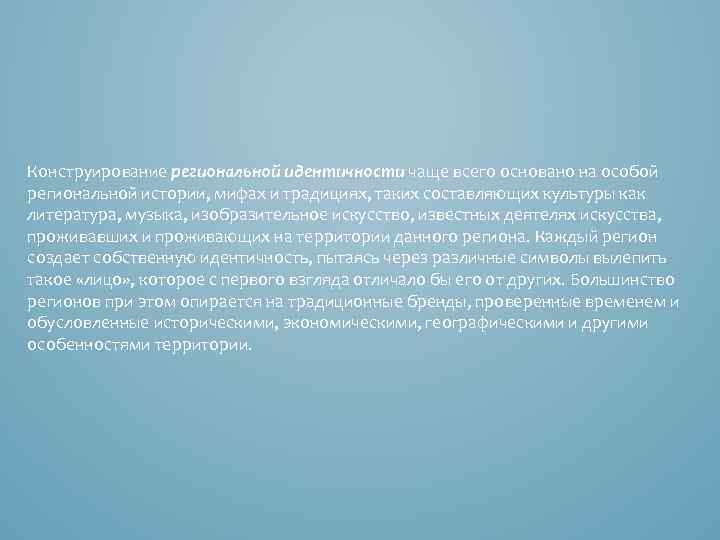 Конструирование региональной идентичности чаще всего основано на особой региональной истории, мифах и традициях, таких составляющих культуры как литература, музыка, изобразительное искусство, известных деятелях искусства, проживавших и проживающих на территории данного региона. Каждый регион создает собственную идентичность, пытаясь через различные символы вылепить такое «лицо» , которое с первого взгляда отличало бы его от других. Большинство регионов при этом опирается на традиционные бренды, проверенные временем и обусловленные историческими, экономическими, географическими и другими особенностями территории.