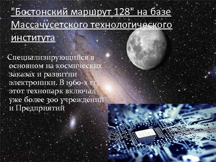 "Бостонский маршрут 128" на базе Массачусетского технологического института Специализирующийся в основном на космических заказах и развитии электроники. В 1960 -х гг. этот технопарк включал уже более 300 учреждений и Предприятий