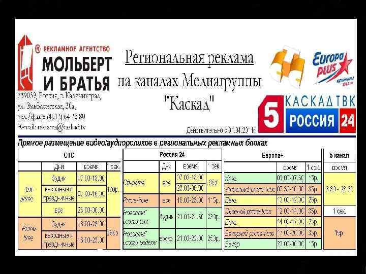 Расценки на размещение рекламы на телеканалах «СТС» и «Россия 24»