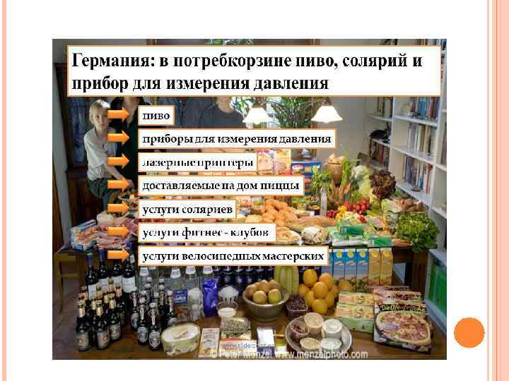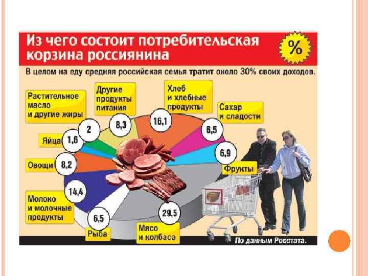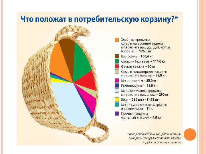 Изменение цен на потребительские товары Оценка реального индекса цен при определении стоимости потребительской корзины. В прожиточный минимум включаются: – расходы на продукты питания из расчета минимальных размеров их потребления, определенных Институтом питания РАМН, Институтом социально-экономических проблем народонаселения РАН; – расходы на непродовольственные товары и услуги, налоги и платежи исходя из структуры расходов наименее обеспеченных семей. В Российской Федерации размер прожиточного минимума рассчитывается согласно Федеральному Закону № 134 -ФЗ от 24. 10. 1997 года (закон «О прожиточном минимуме в РФ» ). Источник: Прожиточный минимум в 2016 году по регионам России сайт bs-life. ru