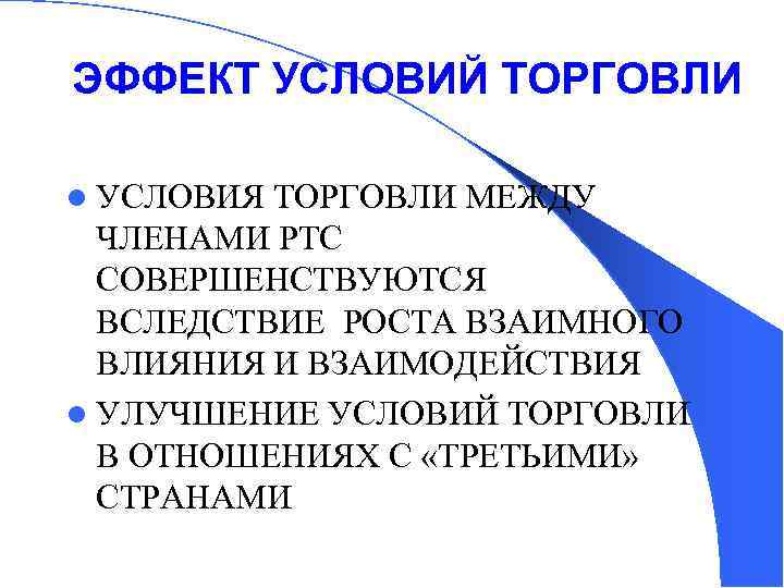 ЭФФЕКТ УСЛОВИЙ ТОРГОВЛИ l УСЛОВИЯ ТОРГОВЛИ МЕЖДУ ЧЛЕНАМИ РТС СОВЕРШЕНСТВУЮТСЯ ВСЛЕДСТВИЕ РОСТА ВЗАИМНОГО ВЛИЯНИЯ И ВЗАИМОДЕЙСТВИЯ l УЛУЧШЕНИЕ УСЛОВИЙ ТОРГОВЛИ В ОТНОШЕНИЯХ С «ТРЕТЬИМИ» СТРАНАМИ