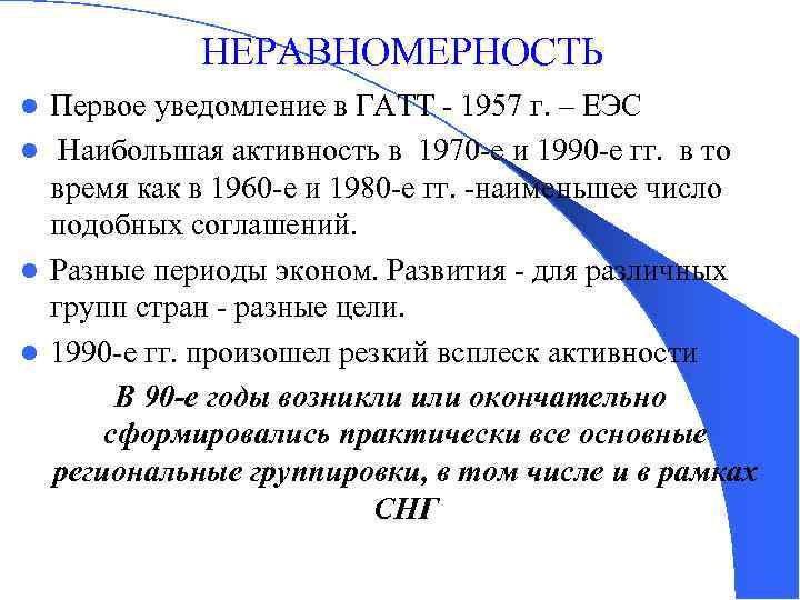 НЕРАВНОМЕРНОСТЬ Первое уведомление в ГАТТ - 1957 г. – ЕЭС l Наибольшая активность в 1970 -е и 1990 -е гг. в то время как в 1960 -е и 1980 -е гг. -наименьшее число подобных соглашений. l Разные периоды эконом. Развития - для различных групп стран - разные цели. l 1990 -е гг. произошел резкий всплеск активности В 90 -е годы возникли или окончательно сформировались практически все основные региональные группировки, в том числе и в рамках СНГ l