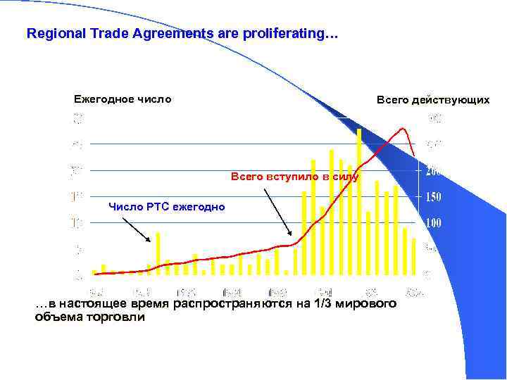 Regional Trade Agreements are proliferating… Ежегодное число Всего действующих Всего вступило в силу Число РТС ежегодно …в настоящее время распространяются на 1/3 мирового объема торговли