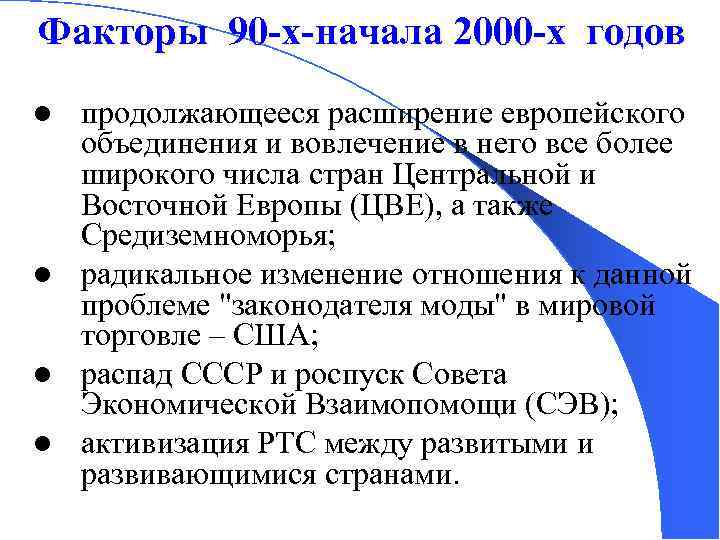 Факторы 90 -х-начала 2000 -х годов продолжающееся расширение европейского объединения и вовлечение в него все более широкого числа стран Центральной и Восточной Европы (ЦВЕ), а также Средиземноморья; l радикальное изменение отношения к данной проблеме "законодателя моды" в мировой торговле – США; l распад СССР и роспуск Совета Экономической Взаимопомощи (СЭВ); l активизация РТС между развитыми и развивающимися странами. l