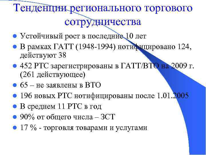 Тенденции регионального торгового сотрудничества l l l l Устойчивый рост в последние 10 лет В рамках ГАТТ (1948 -1994) нотифицировано 124, действуют 38 452 РТС зарегистрированы в ГАТТ/ВТО на 2009 г. (261 действующее) 65 – не заявлены в ВТО 196 новых РТС нотифицированы после 1. 01. 2005 В среднем 11 РТС в год 90% от общего числа – ЗСТ 17 % - торговля товарами и услугами